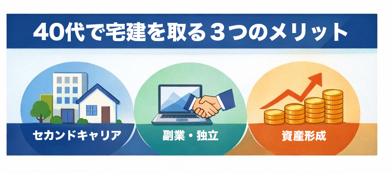 40代が宅建を取ると、セカンドキャリア・副業・資産形成の3つの面で変化が生まれます。